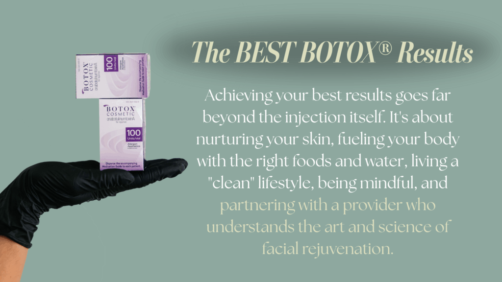 As you can see, achieving your best BOTOX® Cosmetic results goes far beyond the injection itself. It’s about nurturing your skin, fueling your body with the right foods and water, living a “clean” lifestyle, being mindful, and partnering with a provider who understands the art and science of facial rejuvenation.
