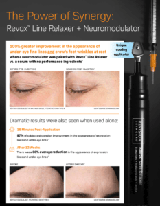 Revox™ Line Relaxer is a targeted treatment serum specifically formulated to work synergistically with wrinkle relaxers like Botox® Cosmetic, and Dysport®. It utilizes patent-pending technology to deliver clinically proven benefits and results both at home and when combined with specific in-office treatments.