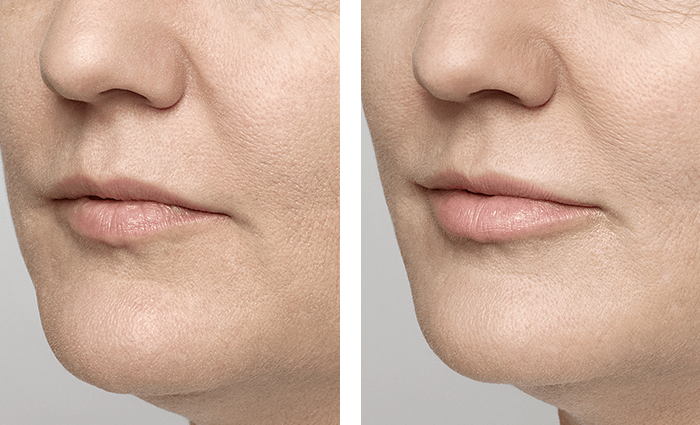 Photos taken before treatment and one month after treatment. A total of 2.3 mL of JUVÉDERM® VOLLURE™ XC was injected into the parenthesis, corner, and marionette lines.