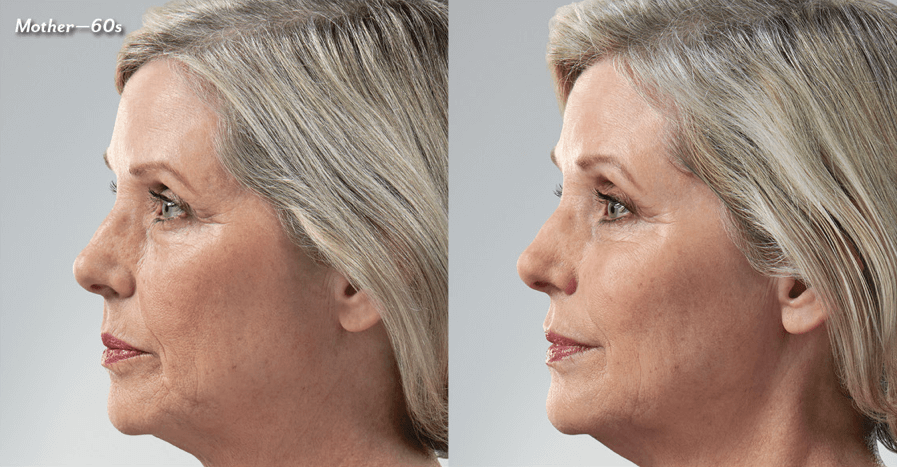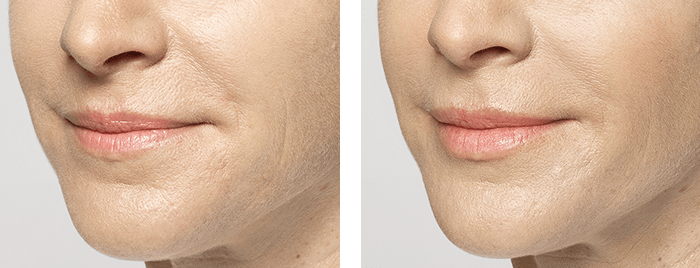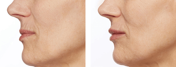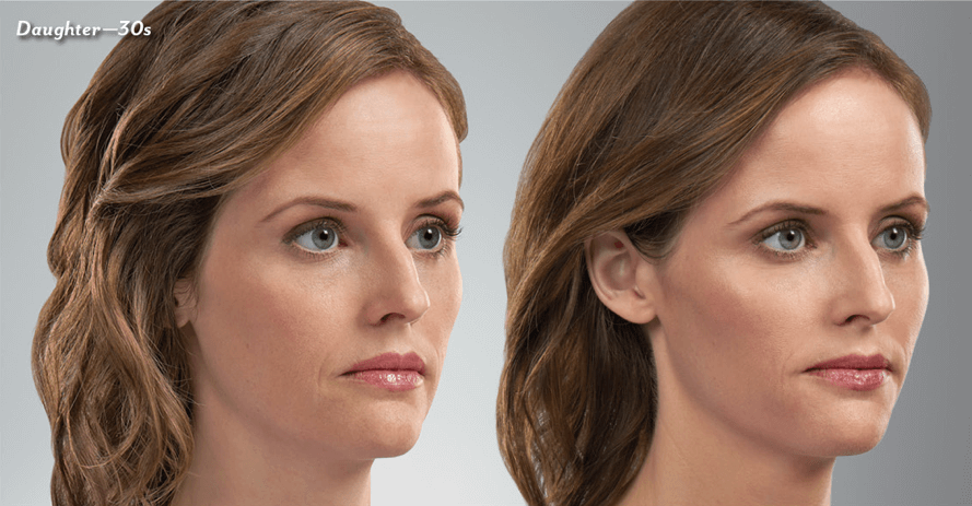 Photos taken before and one month after treatment. A total of 1.4 mL of JUVÉDERM® VOLUMA™ XC was injected into the cheek area. A total of 2.9 mL of JUVÉDERM® VOLLURE™ XC was injected into the parenthesis and marionette lines. A total of 2.2 mL of JUVÉDERM® VOLBELLA™ XC was injected into the vertical lip lines and lips.