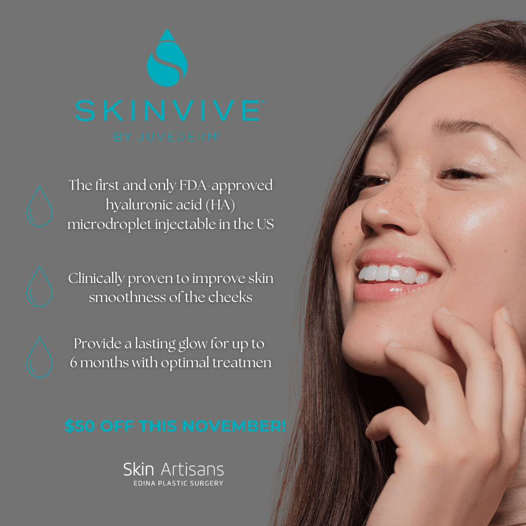 Want to learn more about SKINVIVE™? Schedule a complimentary consultation with a Skin Artisans Injection Specialist by calling (952) 234-8414, texting (952) 767-3163, or CLICKING HERE!