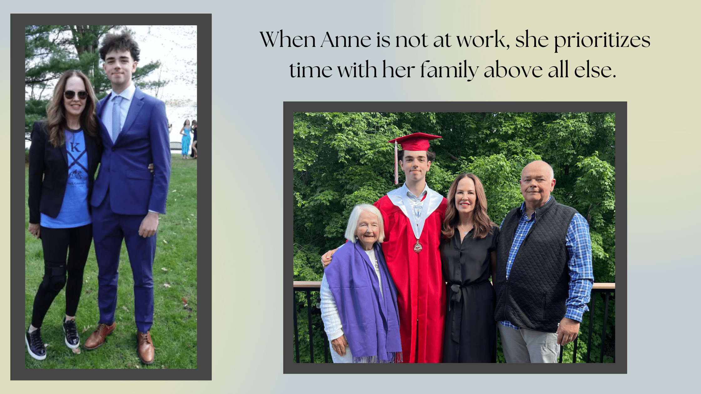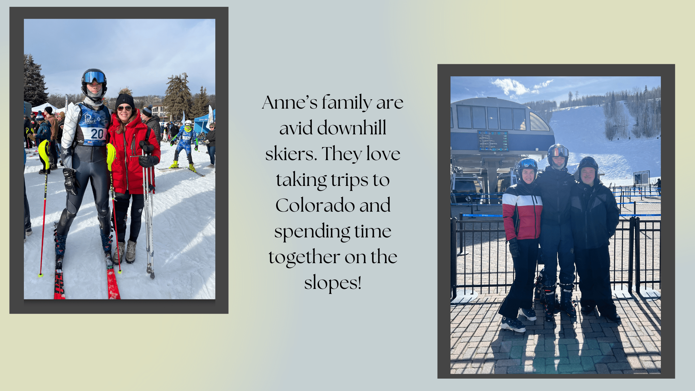 When Anne is not at work, she prioritizes time with her family above all else. They are avid downhill skiers and love taking trips to Colorado and enjoying time together on the slopes!