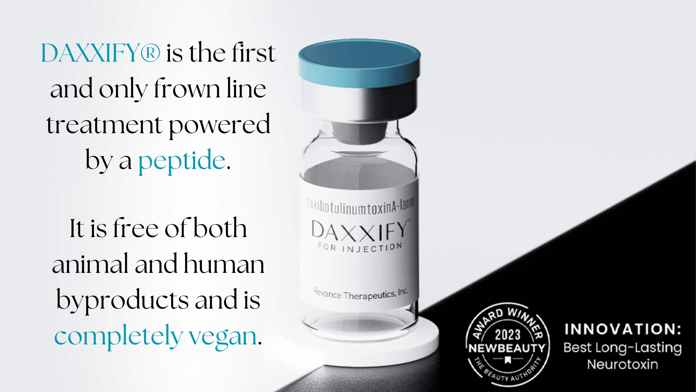 DAXXIFY® is FDA-approved to smooth moderate to severe lines between the brows. It is the first and only frown line treatment powered by a peptide. Similar to BOTOX® and Dysport®, the active ingredient in DAXXIFY® is a purified protein called botulinum toxin type A, but in DAXXIFY®, this protein is stabilized with the support of peptide technology, making it completely vegan and free of animal byproducts and human serum. According to the founder of DAXXIFY®, their scientists discovered this peptide-based formula when attempting to create a BOTOX®-like agent that could be applied to the skin.