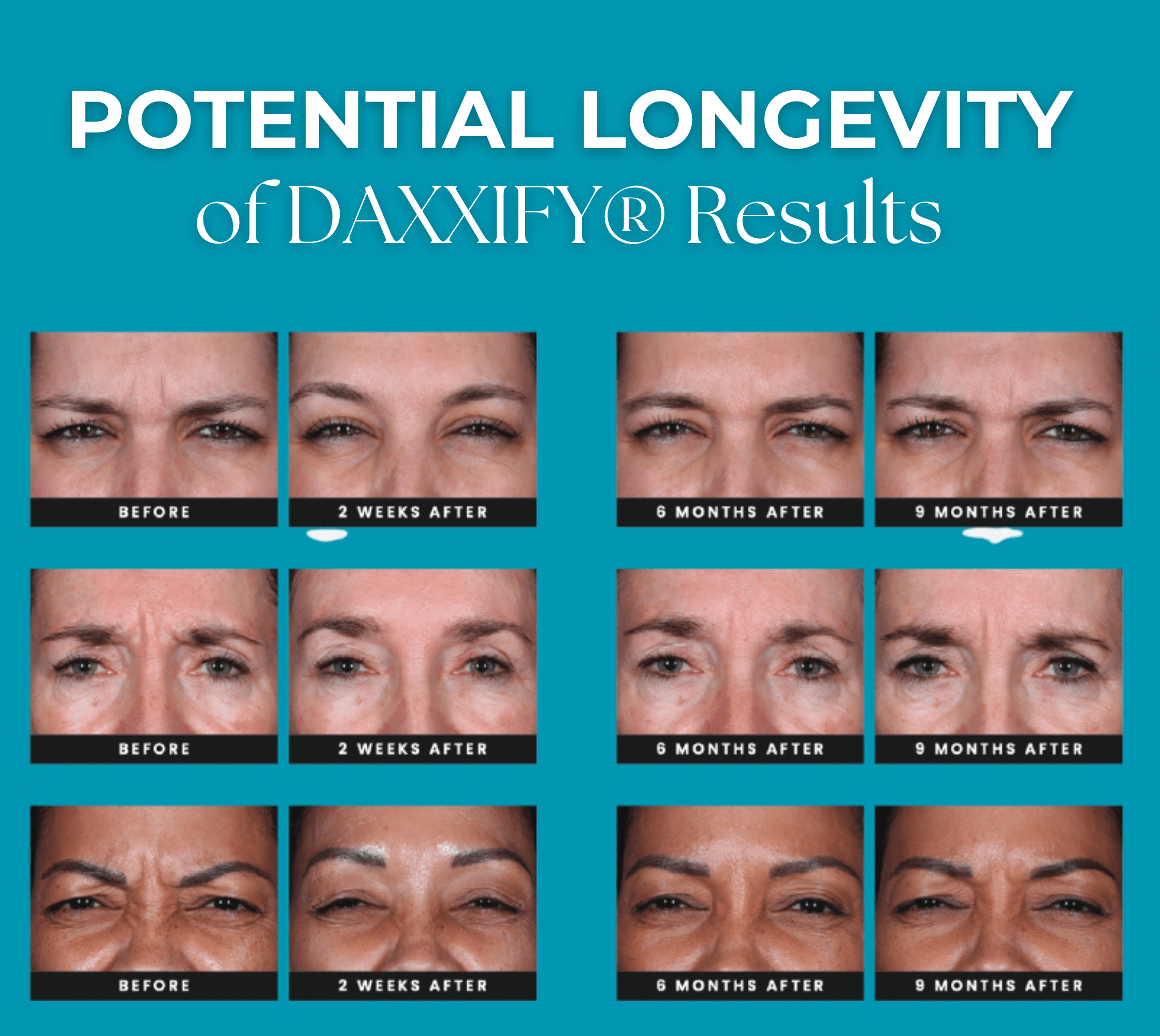 DAXXIFY® is currently being marketed as the wrinkle relaxer that acts fast and lasts. For many patients, this seems to be the case! DAXXIFY® results may be seen in as little as one day, unlike the three days to a week for Dysport® and the ten days of BOTOX® Cosmetic. In addition, patients may find that DAXXIFY® keeps wrinkles at bay for 4-8 weeks longer than BOTOX® and Dysport®—with some reporting even longer-lasting results!