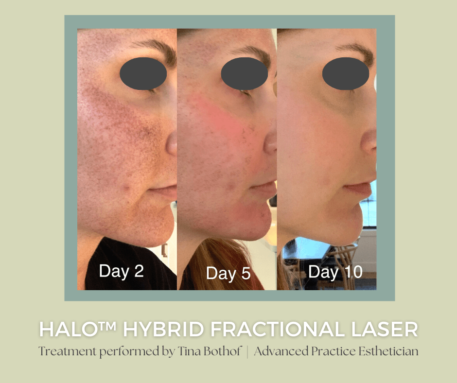 Most patients experience redness, swelling, and a “bronzed” or sandpaper-like texture for 5–7 days as their skin heals and regenerates. Many feel comfortable wearing makeup within a few days. Our team recommends scheduling HALO on a Friday so you have the weekend for redness to subside. Makeup can be worn on the following Monday. Your AP Esthetician can adjust your treatment to allow for more or less downtime depending on your social schedule and desired outcome.