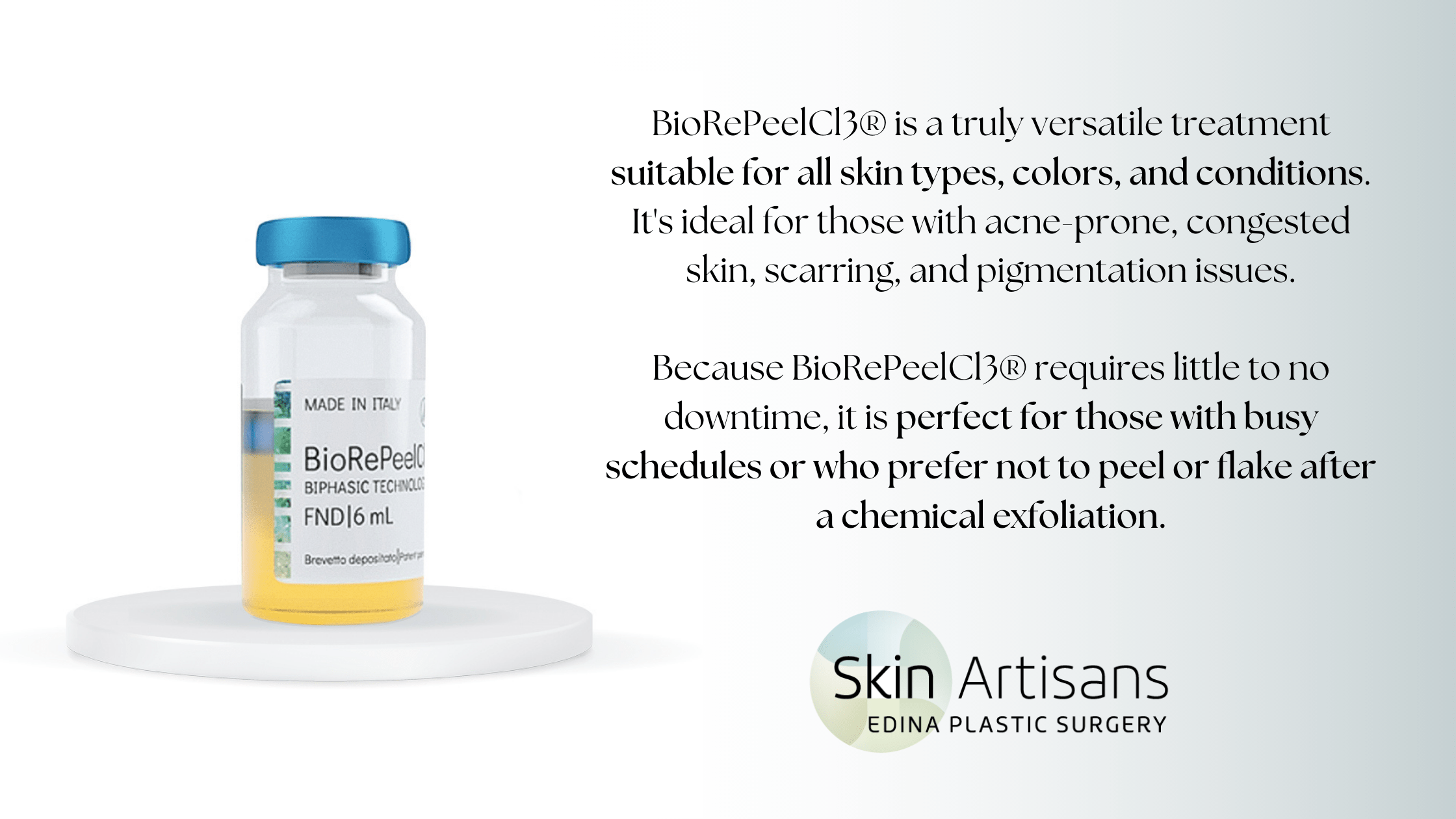 Are you ready to try BioRePeelCl3® yourself? Schedule a complimentary consultation to discuss this innovative new peel by calling (952) 592-5970, texting (952) 767-3163 or CLICKING HERE!