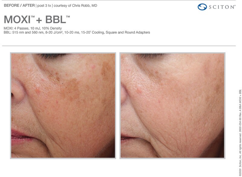 BBL® is a light-based treatment that lightens and removes excess pigmentation in your skin. It helps clear dark spots and reduces redness, creating a more even skin tone. MOXI™ compliments these improvements by resurfacing the top layers of your skin and boosting collagen production. After each treatment, your skin will be clearer, smoother, and dramatically brighter!
