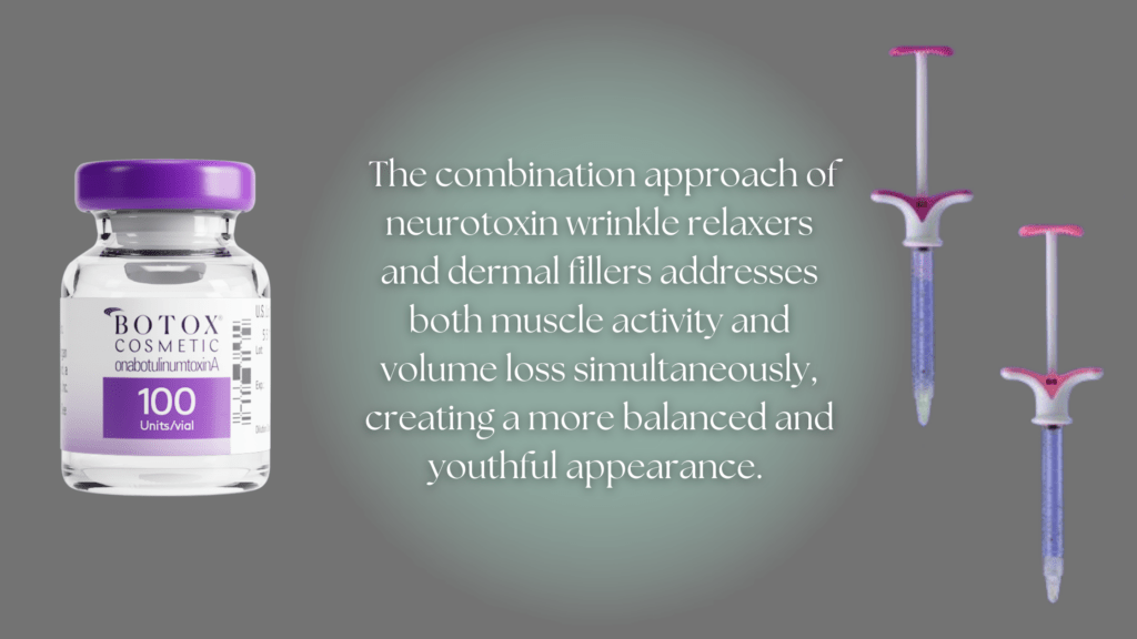 Combining a neurotoxin wrinkle relaxer, such as BOTOX® or Dysport®, with dermal fillers like JUVÉDERM® or Restylane® in the same treatment can provide enhanced, longer-lasting, and more natural-looking facial rejuvenation.