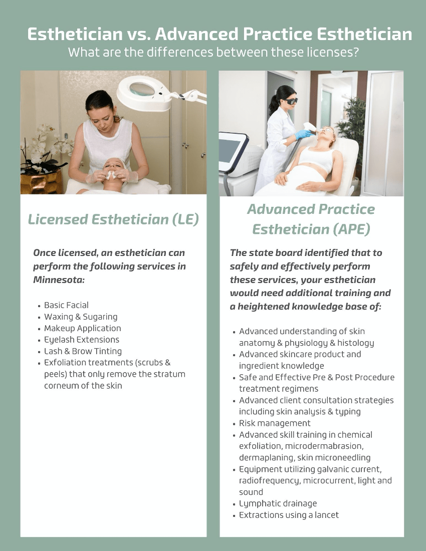 In 2018, the Minnesota Board of Cosmetologist Examiners (MBCE) defined new rules and requirements for estheticians providing more advanced services and working within a medical environment. This new Advanced Practice Esthetician (APE) license focuses on ensuring that estheticians have the proper training and knowledge base to safely provide specific treatments. The APE license requires additional hours of training by the state than a basic Esthetician license.