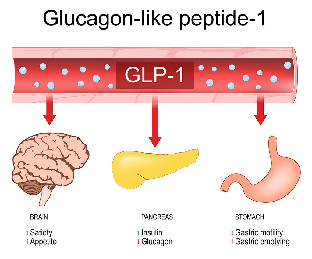 GLP-1 is a hormone secreted by your small intestine. It has several roles in the body, including: