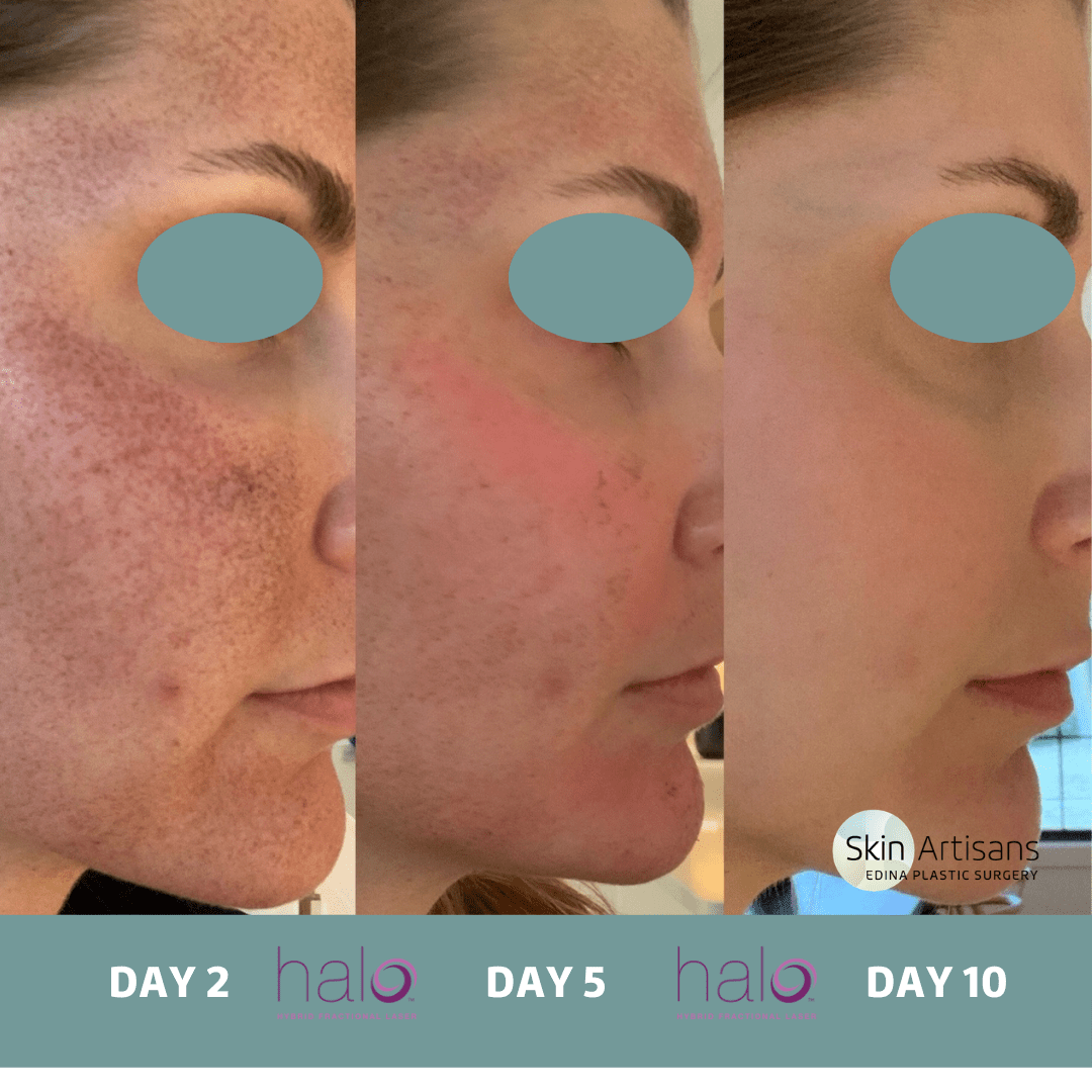 Immediately after HALO™, your skin will undergo a “bronzing” stage for several days. During this time, treated skin will begin to peel and flake, revealing fresh, bright, and revitalized layers beneath. Initial results with HALO™ are seen in the first 2-5 days after treatment, but your skin will continue to improve over the next several weeks. During this time, skin will become clearer, smoother, firmer, and more vibrant.
