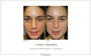 A VI Peel® is a corrective chemical peel that combines powerful acids like Trichloroacetic Acid (TCA), Salicylic Acid, and Retinoic Acid to multi-target layers of skin through intense exfoliation. The VI Peel® is safe for all skin types and colors and can even be used on the body! This unique chemical peel excels at improving skin discoloration, hyperpigmentation, static wrinkles, skin laxity/sagginess, and rough skin texture, often brought on by the aging process, sun damage, dryness, or post-acne scarring.
